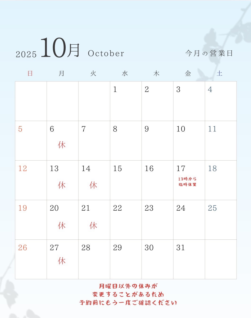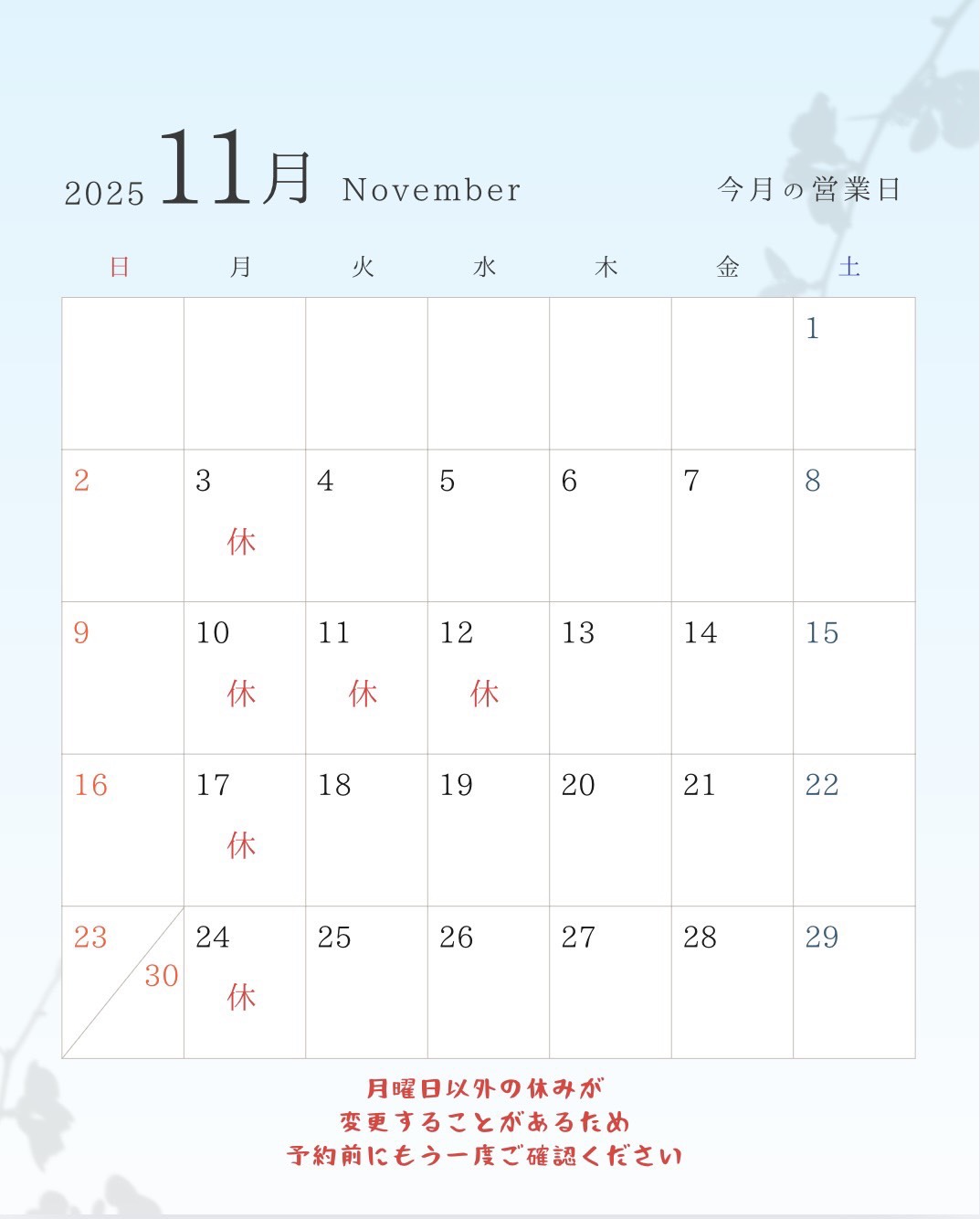 10.11月の営業カレンダーです。 早めの予約がおすすめです♪
